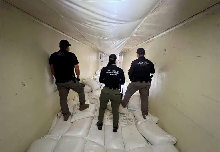 En Los Mochis, Sinaloa en una acción encabezada por la Agencia de Investigación Criminal de @FGRMexico y el @GabSeguridadMX detuvieron a dos personas por delitos contra la salud, tras asegurar: 320 kg de metanfetamina ocultos en un tractocamión Volvo con caja refrigerada. Con esta acción se evita que miles de dosis de droga lleguen a las calles”, explicó García Harfuch.